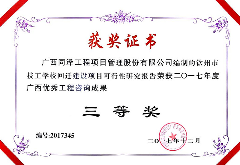 欽州市技工學(xué)?;剡w建設(shè)項(xiàng)目可行性研究報(bào)告榮獲2017年度廣西優(yōu)秀工程咨詢成果三等獎(jiǎng)