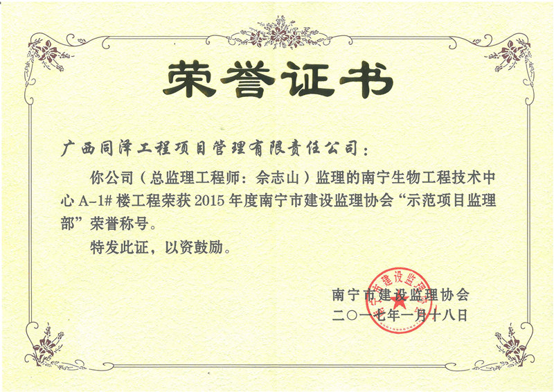 南寧生物工程技術(shù)中心A-1#樓項(xiàng)目榮獲2015年度“示范項(xiàng)目監(jiān)理部”榮譽(yù)稱號(hào)