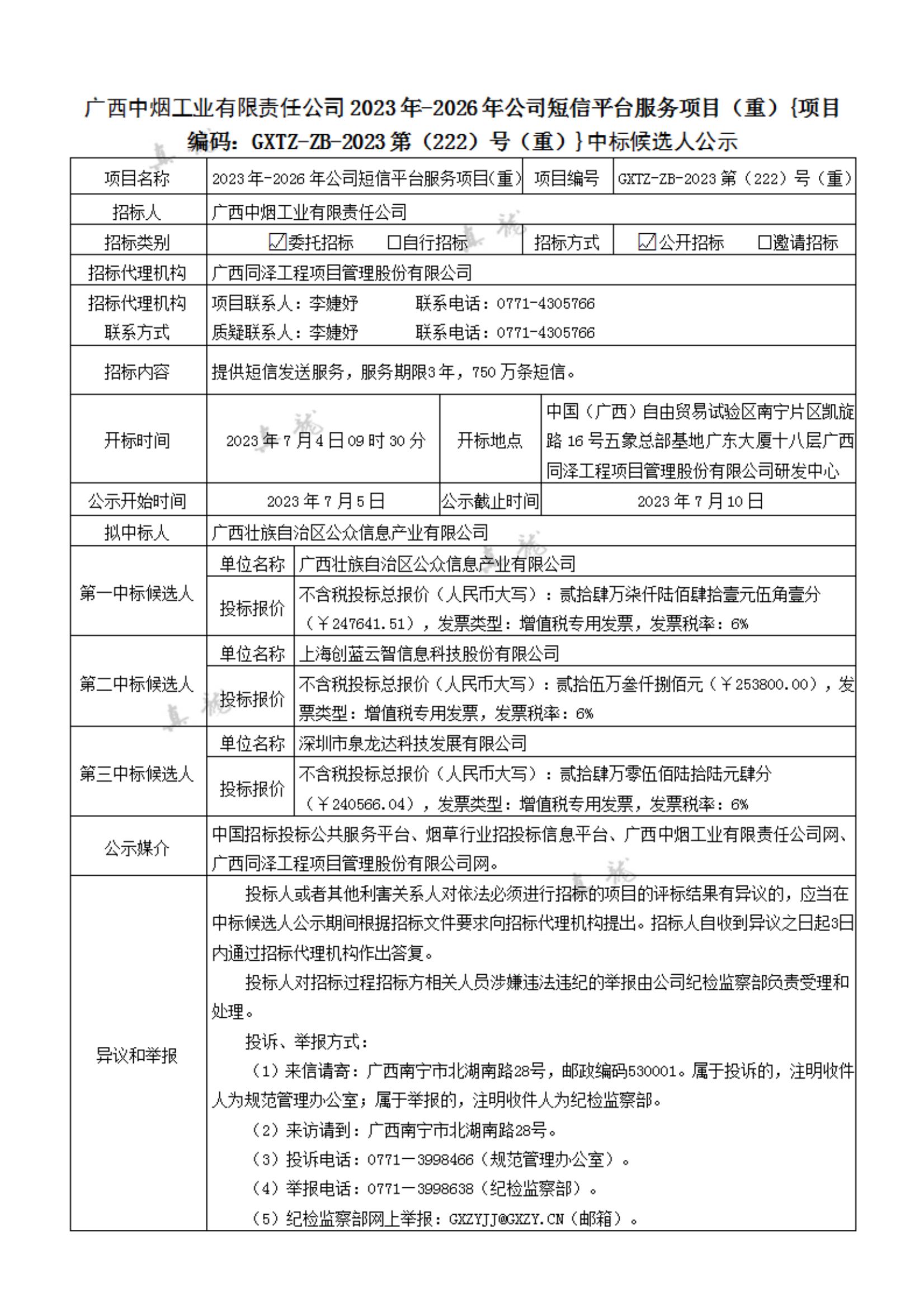 廣西中煙工業(yè)有限責(zé)任公司2023年-2026年公司短信平臺服務(wù)項目(重){項目編碼:GXTZ-ZB-2023第(222)號(重)}中標(biāo)候選人公示