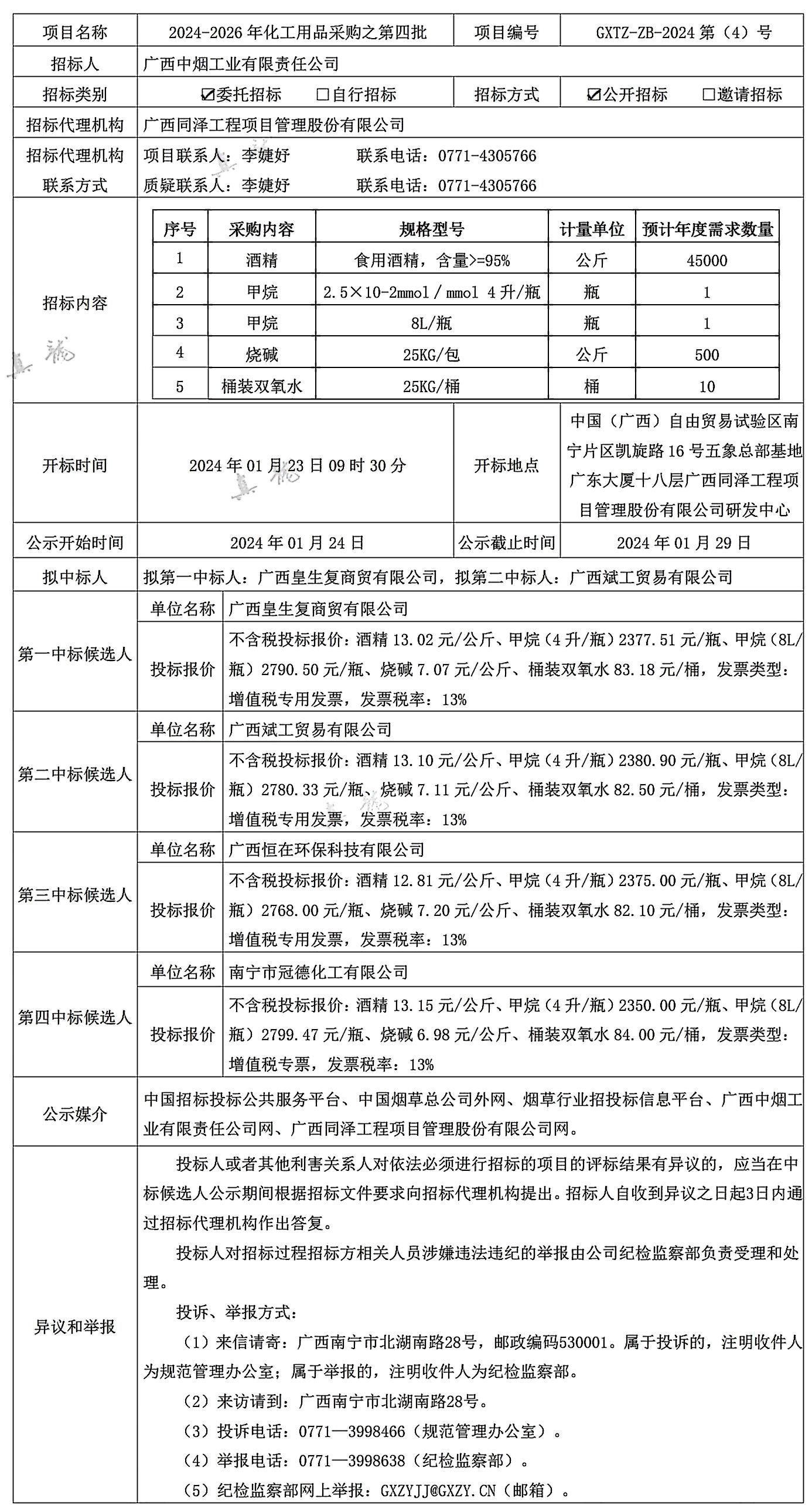 廣西中煙工業(yè)有限責(zé)任公司2024-2026年化工用品采購之第四批(項(xiàng)目編號:GXTZ-ZB-2024第(4)號)中標(biāo)候選人公示