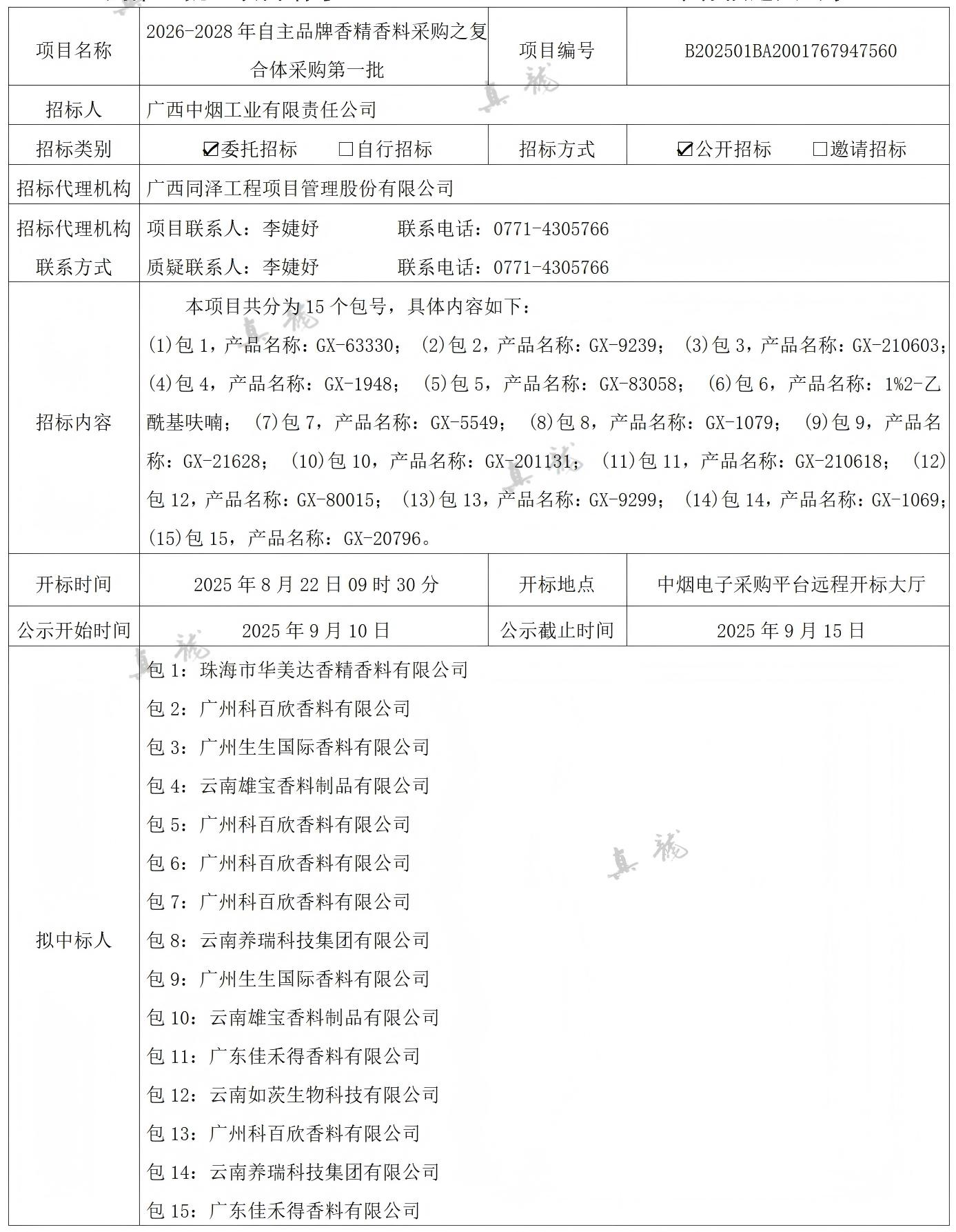 廣西中煙工業(yè)有限責(zé)任公司2026-2028年自主品牌香精香料采購之復(fù)合體采購第一批(項(xiàng)目編號:B202501BA2001767947560)中標(biāo)候選人公示