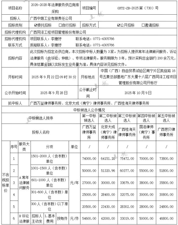 廣西中煙工業(yè)有限責(zé)任公司2026-2028年法律服務(wù)供應(yīng)商庫采購(項目編號:GXTZ-ZB-2025第(730)號)中標(biāo)候選人公示